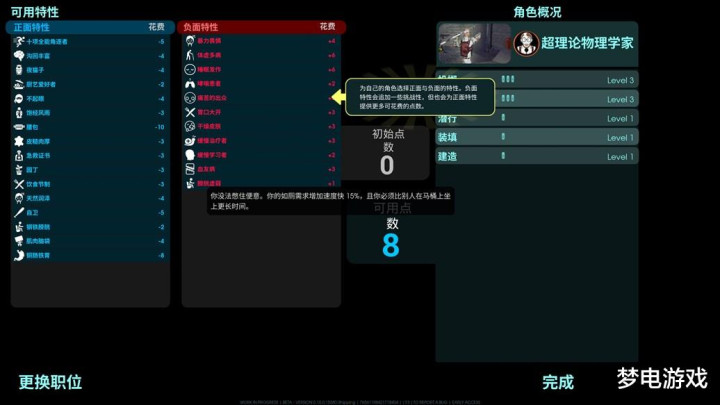 游戏的开局有职业的设定,不同职业会有一些不同的属性等级。除职业之外,游戏开局还有天赋点的设定,游戏给玩家两列增益和减益BUFF列表,每个BUFF后面有天赋点需求,增益需要消耗天赋点,减益BUFF则增加天赋点,以此互相消耗给予来让玩家选择开局的天赋(这个其实很像僵尸毁灭工程)。