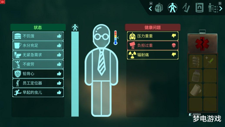 除基础的这些外,角色会有其他的负面BUFF,比如背包东西过重会减缓速度,甚至腿部受伤骨折、在一些区域体温会降低、辐射值会偏高等等。整个游戏在生存方面做得非常棒,每个生存设定存在感都很足。
