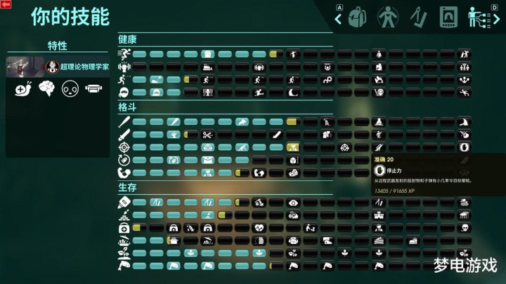 游戏在各方面都有经验的设定,比如潜行、冲刺、坚韧、烹饪、农业、钓鱼等等等等,角色做相对应的动作、行为,就会积累相应经验,每五级会有一个增益效果加持,每个方面满级为20级。所以我上文说,开局职业的属性差距,后期可以刷级弥补。
